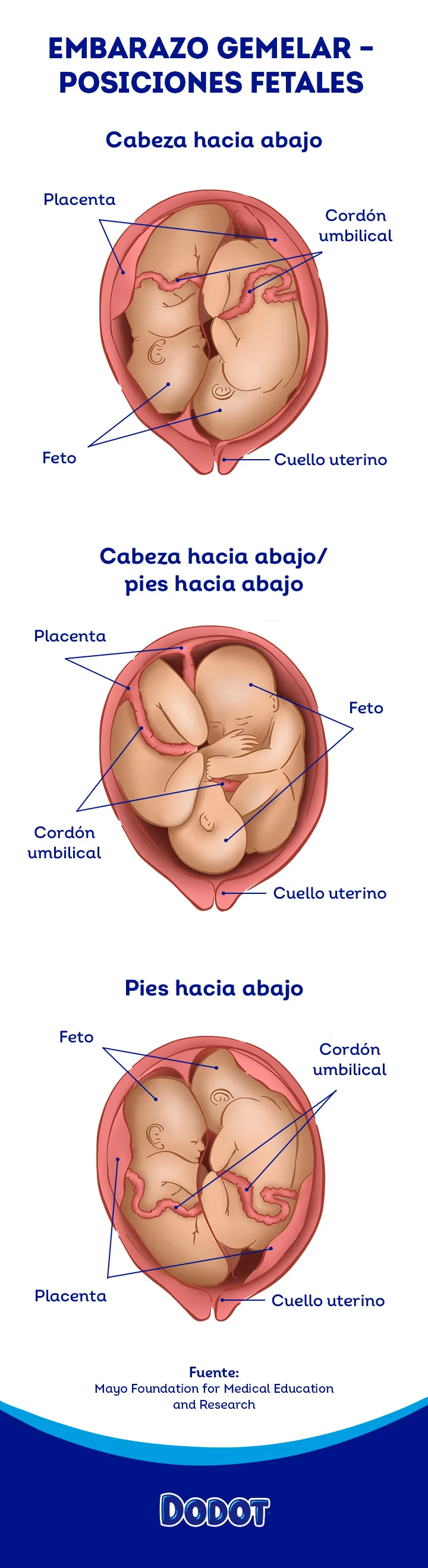 En el tercer trimestre, entre los síntomas más comunes del embarazo que pueden aparecer semana a semana se encuentran los dolores de espalda y la hinchazón de manos, pies y piernas, por lo que quizá te cueste dormir o caminar. Mientras tanto, tus pequeños se preparan para el gran día. Durante este periodo, oyen sonidos familiares, como tu voz, y quizá se acomoden en la mejor posición para un parto vaginal (ambos bebés con la cabeza hacia abajo). Sin embargo, es posible que un bebé o los dos tengan los pies hacia abajo. Échale un vistazo a esta imagen para hacerte una idea de cómo pueden estar tus bebés en el útero. Y no te olvides de que en los embarazos gemelares hay una mayor probabilidad de necesitar un parto por cesárea o de dar a luz de forma prematura.